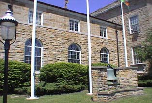The two-story core block is flanked by one-and-one-half-story wings. The building is clad in stone/" class="glossaryLink" data-cmtooltip="1dd0660f95b8b9e1c704dae47df621a6" target="_blank" >ashlar/" class="glossaryLink" data-cmtooltip="9be5ba1499df02e9f8da61fb76746dd5" target="_blank" >range-work/" class="glossaryLink" data-cmtooltip="5ae5df373dfe167528ec1152b4ba257a" target="_blank" >coursed veneer/" class="glossaryLink" data-cmtooltip="002bbee0d2255b25f503f0329bcb5be8" target="_blank" >ashlar veneer. A broken elliptical pediment over flat engaged columns marks the central main entrance of the core building, which is accessed by a set of steps and entrance porch. Fenestration is symmetrical, with core façade windows set in recesses. Flat arches of angled soldiered bricks are used on core block twelve-over-twelve/" class="glossaryLink" data-cmtooltip="2445867ccd027011c0ac864717ae2acc" target="_blank" >twelve-over-twelve windows, while round arch eight-over-twelve/" class="glossaryLink" data-cmtooltip="60aca9b3daad6404d3a60496f1894832" target="_blank" >eight-over-twelve windows are found on the lower level of the wings. These windows are capped by fanlights with tracery. The upper level wing windows are window/" class="glossaryLink" data-cmtooltip="5f67fd917aaf82803e145ac74b779a56" target="_blank" >casement type with eight panes per side. These windows rest on a running stone sill course and are capped by broad lintels that are flush with the wall-plane/" class="glossaryLink" data-cmtooltip="e0b18abb525ecf01cb22d717d13e7141" target="_blank" >wall plane. The wings carry hipped roofs while the core is flat roofed. A narrow and flush string-course/" class="glossaryLink" data-cmtooltip="1c003d69863f740ce4fcd479998ed78b" target="_blank" >string course runs above the second floor windows. Above this but below the termination of the wall plane is a narrow projecting stone cornice. Behind the building at the river is a concrete revetment capped by a concrete balustrade with Colonial Revival detailing.