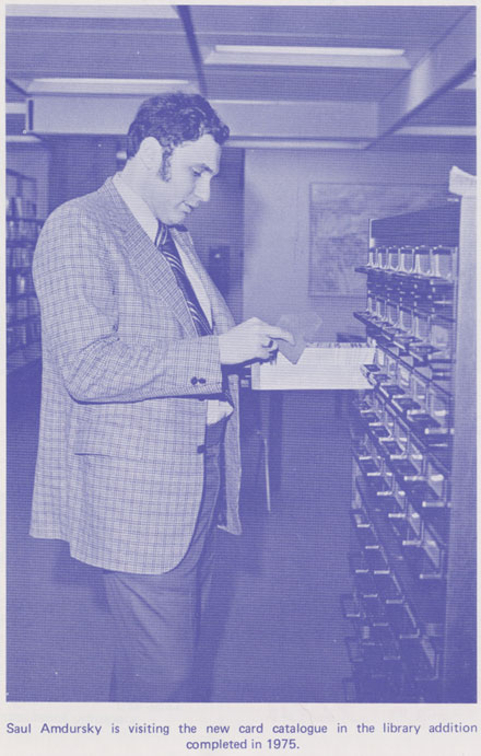 Image caption: Saul Amdursky is visiting the new card catalogue in the library addition completed in 1975.