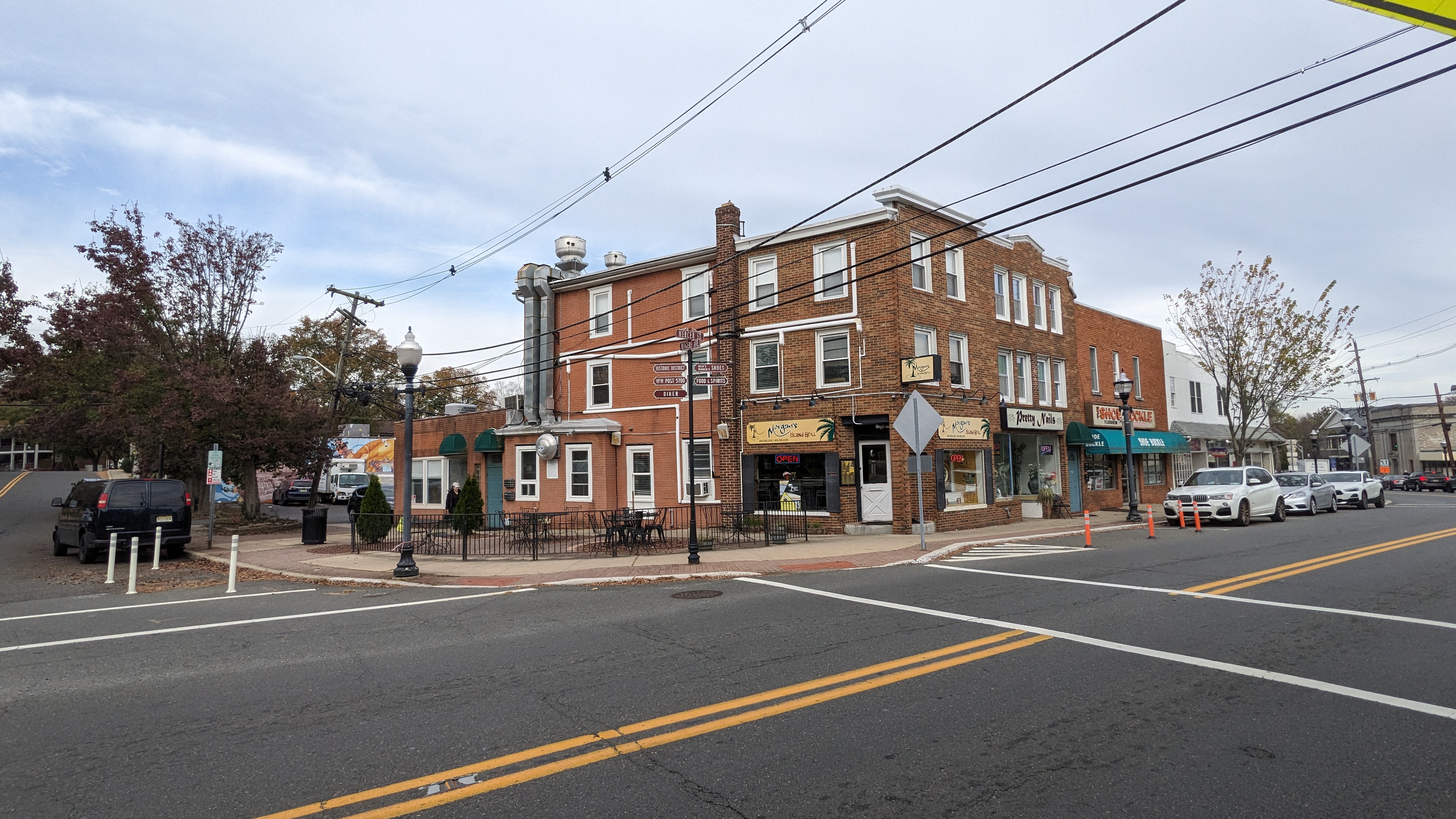 Multi-story buildings provide for businesses space downstairs and residential above. A corner lot is converted for social gathering and outdoor dining.