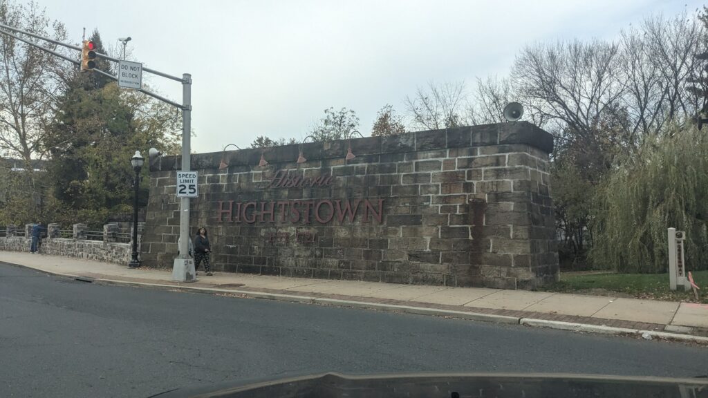 This gateway signage for Historic Hightstown is substantial and has external lighting so it also stands out at night. Monumental in scope it sets a tone for what people should expect in town.