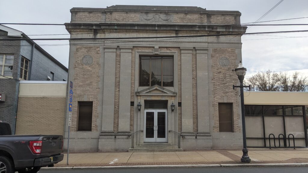Neoclassical Revival bank with paired pilasters and a pedimented door opening has a solid presence downtown. A swag in the parapet over the main entrance completes the composition. Stone trim enframes brick walls including the simulated quoins on the corners. Modern windows inset above the entrance door, and the replacement aluminum entrance doors take away from the otherwise refined look of this building.