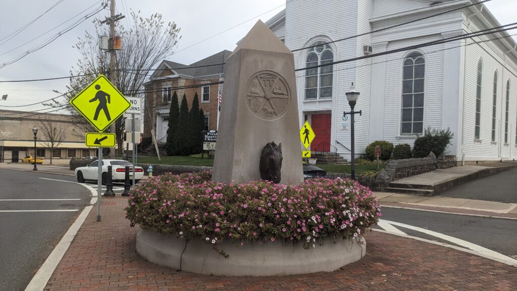 A wonderful civic monument in the heart of the downtown is this obelisk. The city seal appears to be inscribed in the stone above. Then a horse sculpture is below. Was this a horse trough and tie up at some point?