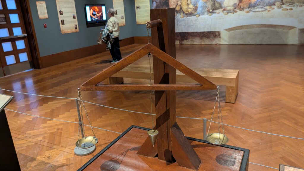An instrument for measuring the degree of moisture suspended in the air and predict changes in the weather. Leonardo da Vinci created a simple set of scales with cotton on one end and a non-absorbent substance, such as wax. When humidity is in the air it is absorbed by the cotton that becomes heavier than the wax, tipping the scale. (Kremer, 2025) Photo from The Henry Ford Dearborn, Michigan, 2025.