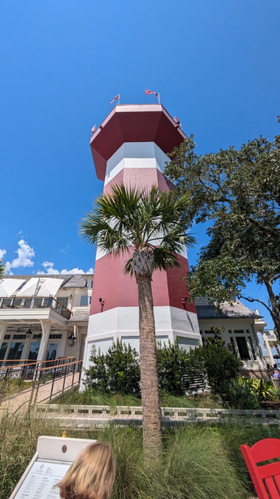 A tower -like building to hold and serve a guiding light with its individual characteristics, usually on a coast. Photo from HarbourTown, Hilton Head Island, South Carolina. (Saylor, 1952)