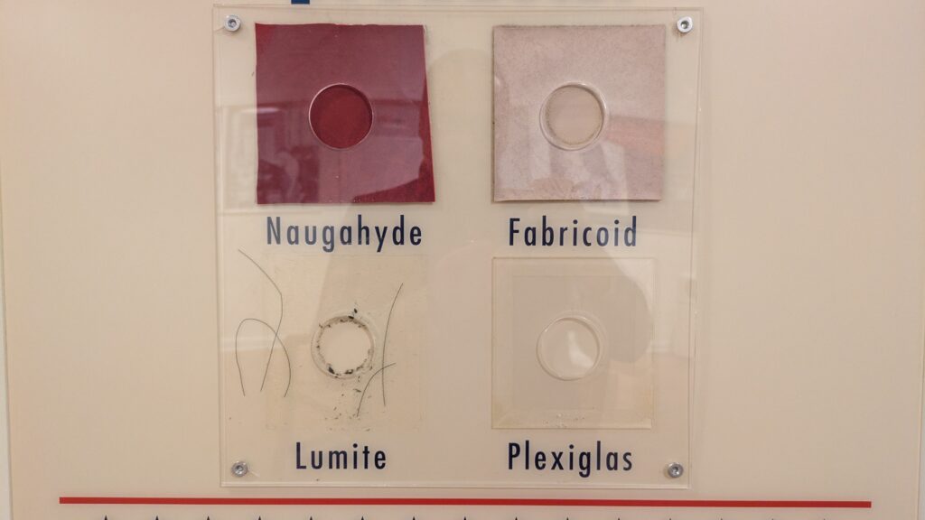 Artificial leather that can be scrubbed. Utilized in the prototype for Buckminster Fuller’s Dymaxion House. (Kremer, 2025) Non-breathable upholstery material like Naugahyde could cause bedsores. (Rybinski, 2016) Photo from The Henry Ford, Dearborn, Michigan, 2025.