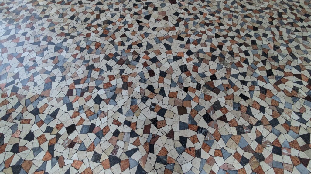 A mosaic terrazzo finish consisting of cut or fractured marble slabs set by hand in the desired pattern, with smaller chips filling the spaces between. Also see berliner. (Kremer, 2017) Photo from Rome, Italy, 2025.
