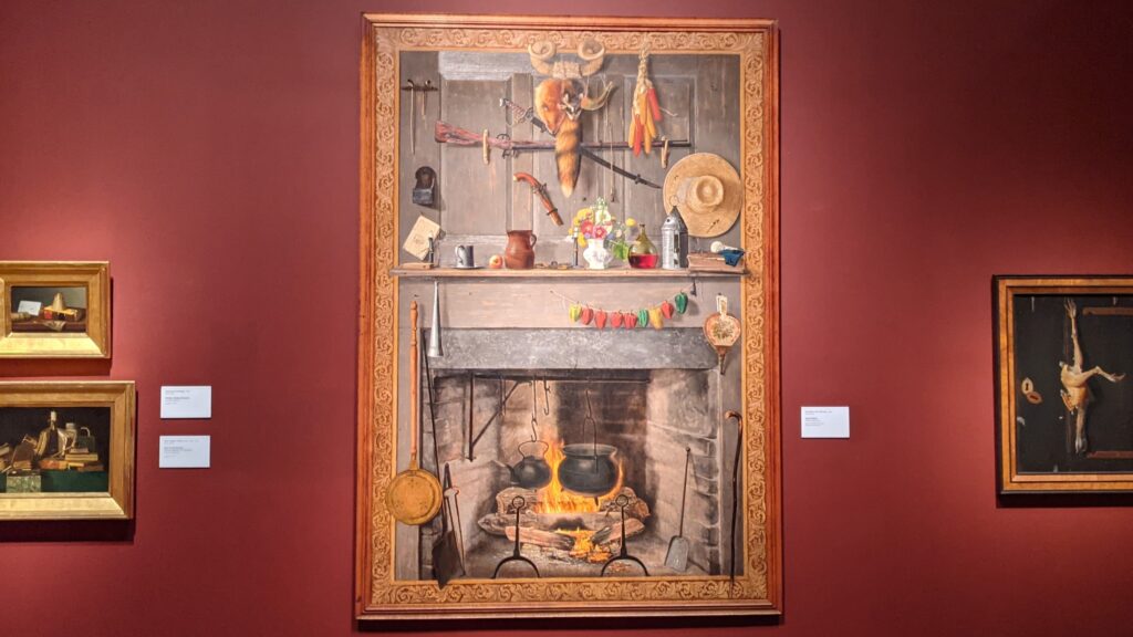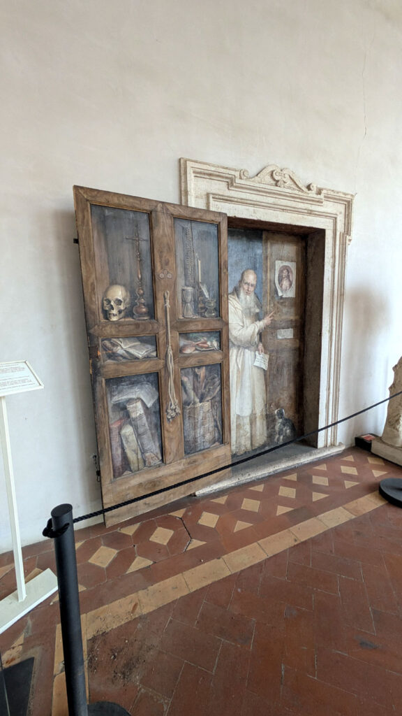 In French, for “fool the eye.” A drawing or painting that imitates reality so closely that it might momentarily fool a viewer into thinking the scene is real. Objects are rendered in extremely fine detail to emphasize the illusion of tactile and spatial qualities. “In its clever confusion of life and art, prefigured much later experiments with optical devices such as cameras obscura, panoramas, dioramas, and catoptric art” (King, 2000). Photo from Museo Nazionale Romano, Rome, Italy, 2025. (Kremer, 2023)