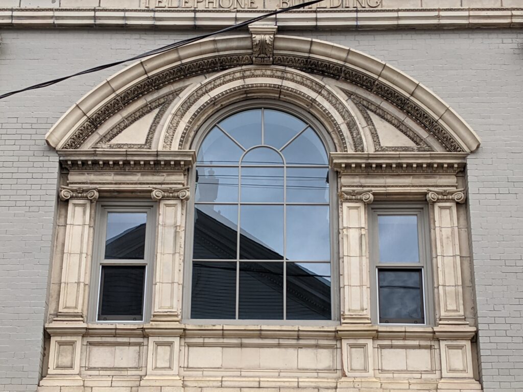 A group of three windows. The central one is wider and taller than the rest and is round-headed. The two side windows are square-headed. See Palladian. Perhaps any window with sidelights and an elliptical top-light. See Venetian Door. Photo from Newport, Rhode Island, 2021. (Isham, 1928)