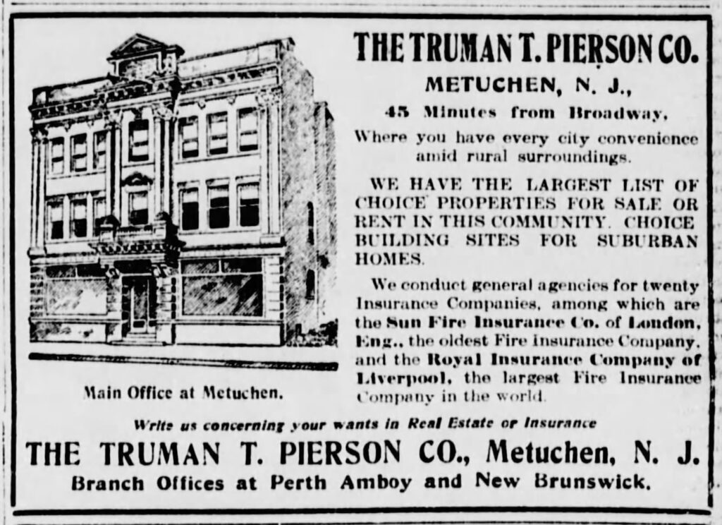 Advertisement for The Truman T. Pierson Co. that had its offices in the Metuchen National Bank Building, April 2, 1911.