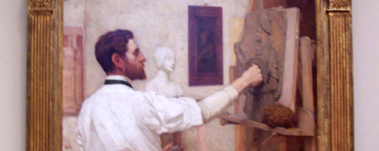 The Angel of Death and the Sculptor from the Milmore Memorial by Daniel Chester French was executed in marble after a bronze of 1889-1893. This is one of the most creative and moving funerary monuments executed during the late nineteenth century. The original bronze relief, cast in Paris, marks the Milmore family plot in Forest Hills Cemetery in Jamaica Plain, Massachusetts. The memorial represents Death interrupting the activity of Martin Milmore, a sculptor who died in 1883 at the age of thirty-nine. Milmore is shown carving a sphinx, which he actually did for Mount Auburn Cemetery in Cambridge, Massachusetts. The poetic form and content of the sculpture, with its successful integration of the real and the ideal, make the Milmore Memorial a profound statement on the creation of art and the cessation of life. French hired Piccirilli Brothers Studio to carve this marble replica for the Metropolitan Museum of Art. It was completed in 1926 with a few compositional refinements.