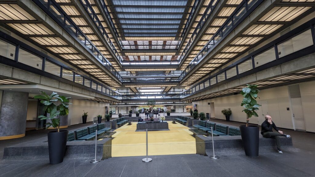 View of one small part of the exterior curtain wall at Bell Labs. It goes on endlessly enveloping the enormous space inside.