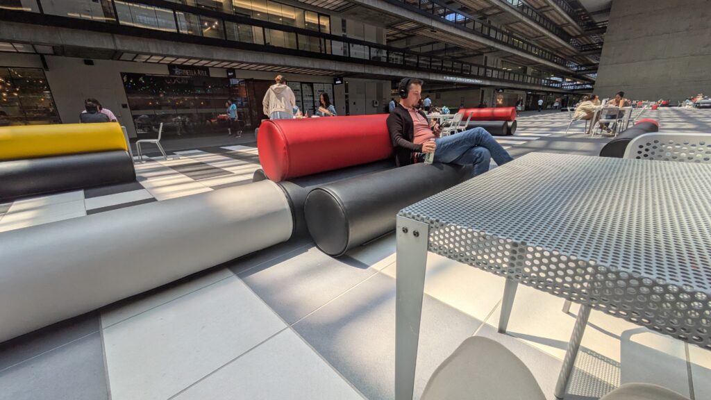 Distinctive furniture, some of which is movable, helps to realize the placemaking potential of this sizable space. It is possible to sit down and not feel crowded at all with tables amply spaced apart from one another.