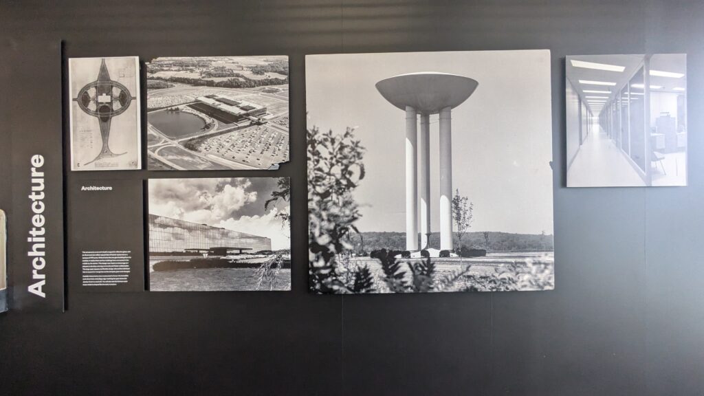 Bell labs is wrapped in reflective glass, with six floors and two million square feet of interior space set on a campus of 473 acres. The Master Plan was completed by Sasaki, Walker and Associates. The design was meant to encourage employees to develop a strong community and foster collaboration. The large open spaces and flexible design allowed the individual labs to expand or reorganize as the company grew and changed. Outside monuments were constructed to honor the innovative work done here. A sign marks the spot where the Jansky Antenna was built. There is also a famous water tower shaped like an early transistor.