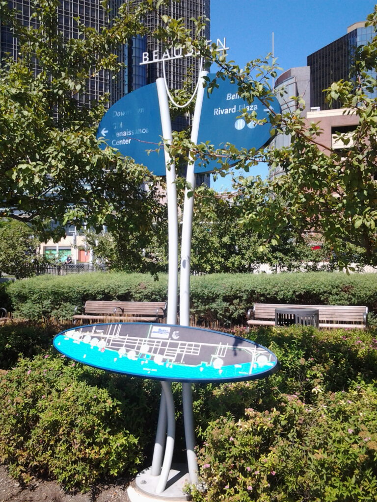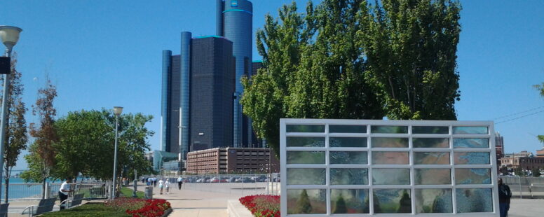View looking south towards the Renaissance Center showing the Renaissance Center in the distance and public art with glass panels showing the outlines of all the Great Lakes while having a watery effect.
