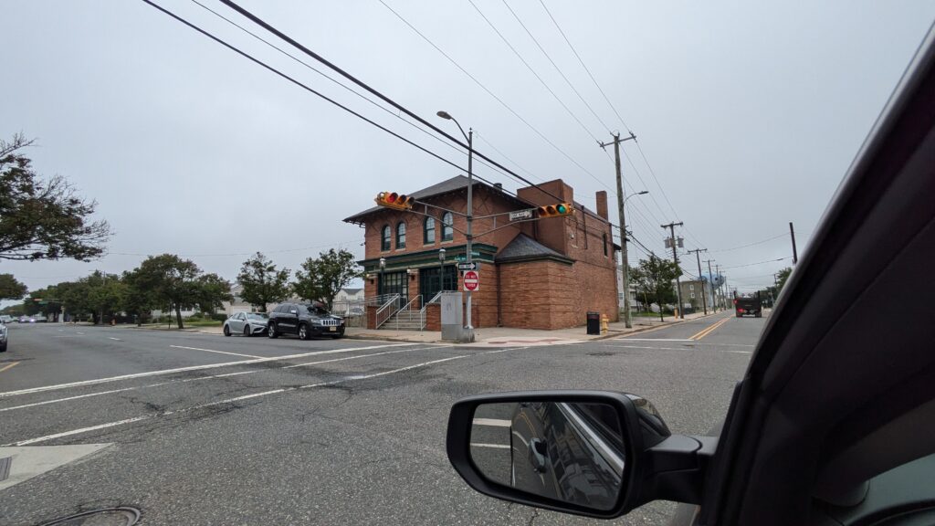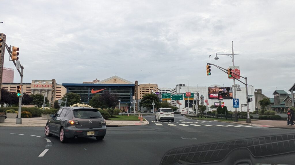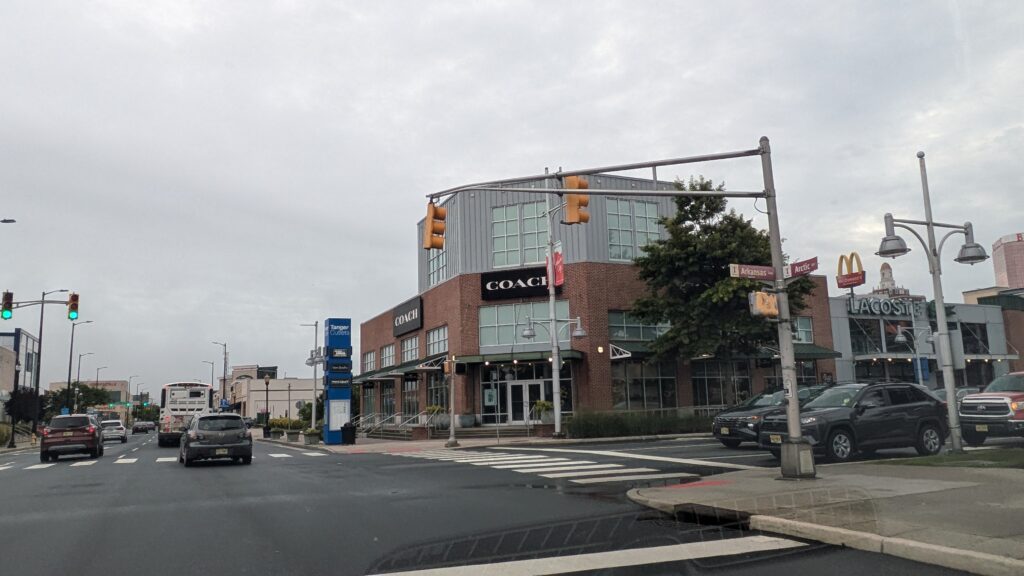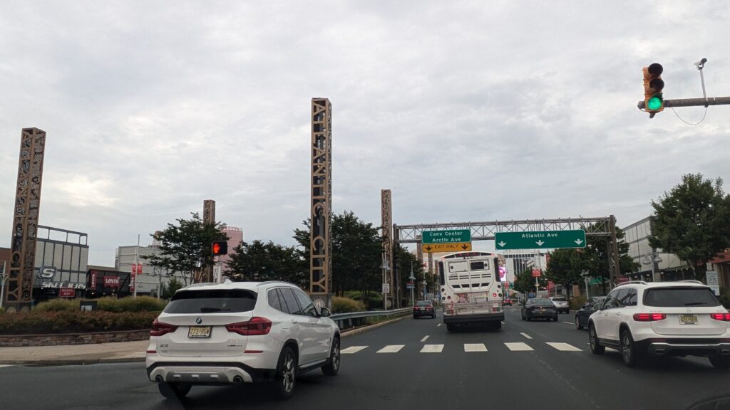 The entrance into Atlantic City gives a nice sense of arrival with these vertical pylons with stylized letters. A cluster of national chain stores makes it clear this is a shopping destination.