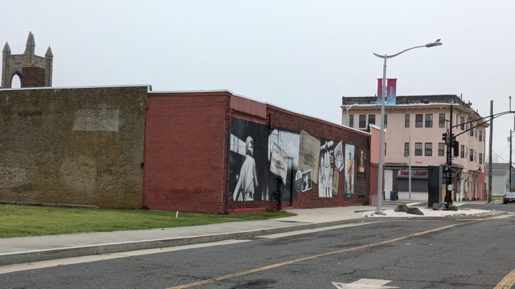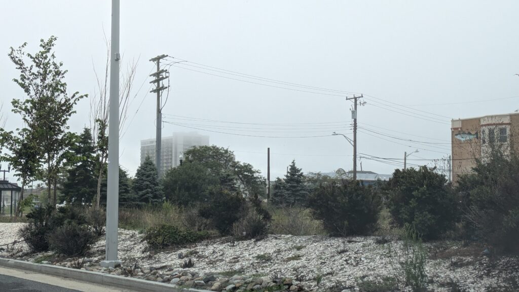 Closer to the resorts buildings are a patchwork, interspersed with vacant lots. The public art on this building caught my eye. Unfortunately many storefronts were boarded over – a likely signal of their subsequent erasure and replacement with something new and modern.