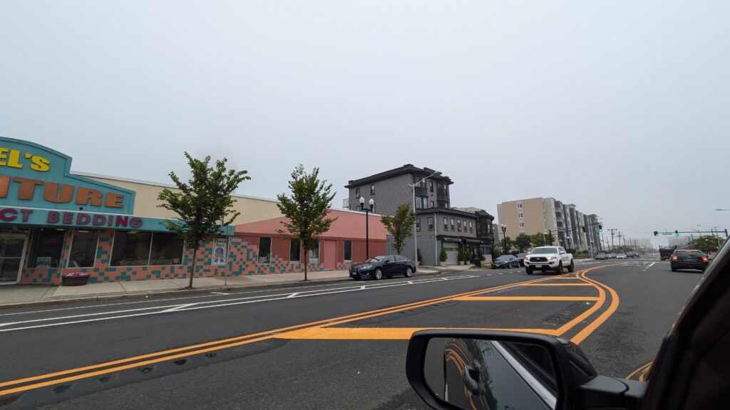 The shopping center gives way to a more traditional downtown with businesses more oriented towards residents.