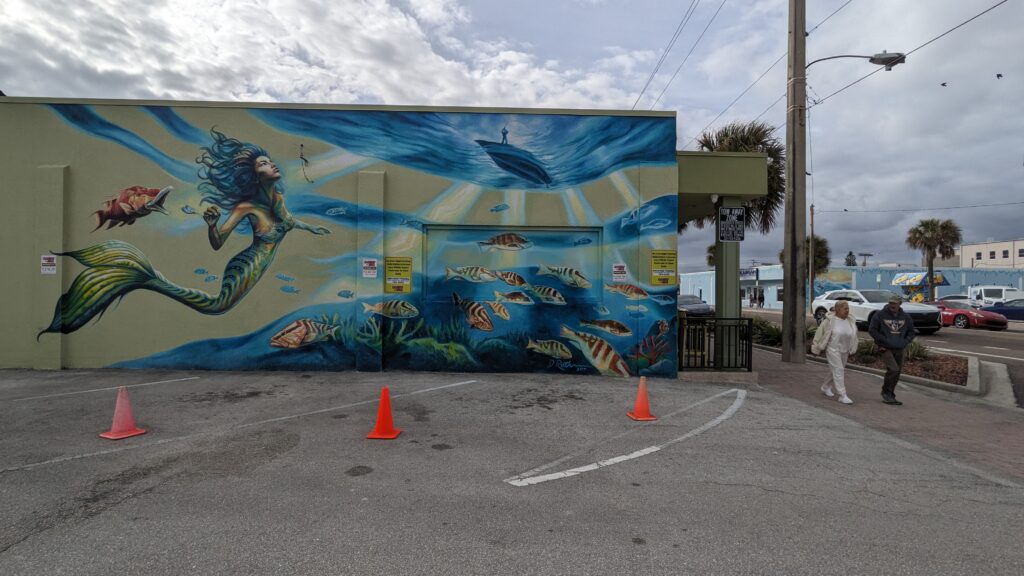 And, yet another mural has a mermaid with other fish swimming below water. A fishing boat is ominous floating above near the top of the mural with radiant sunlight beaming down and through the water.