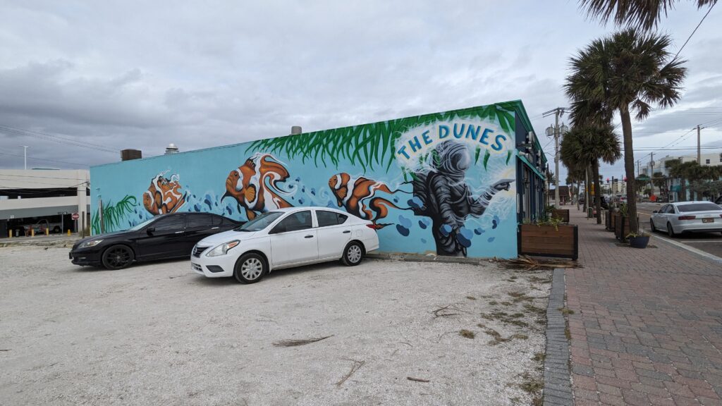 Another mural has ornamental piece/" class="glossaryLink" data-cmtooltip="ce876b4f6da9fa82d5de873b586ebaf5" target="_blank" >fish swimming on the side of the building and the text “The Dunes” over a figure in scuba diving gear.
