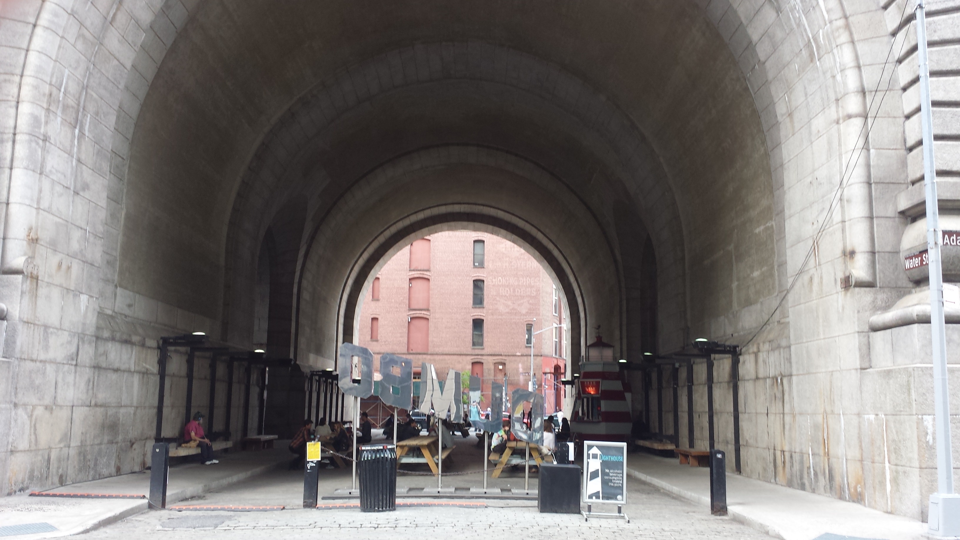 The area beneath the bridge where Water Street passes through, was adapted into a public space. Picnic tables run down the center. Uplighting of the masonry barrel arch give the space a presence after dark.