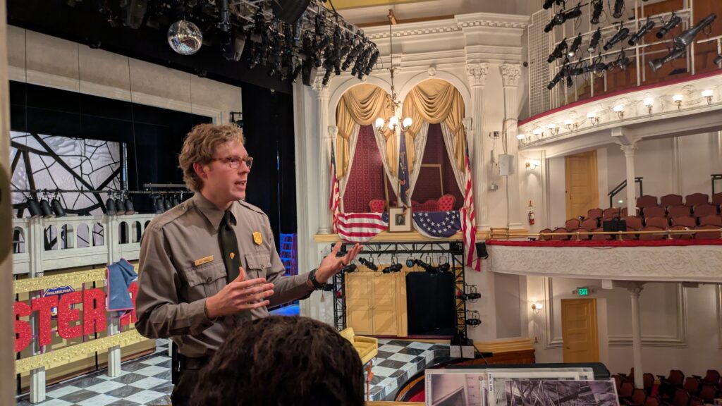 During a guided tour a NPS ranger explains how the theater was reconstructed after going through various incarnations including an office building. None of the materials are original.