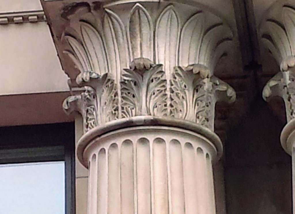 A small molding that is semicircular in section; generally has a fillet on one or both sides; may be plain or ornamented. Photo from Philadelphia, Pennsylvania, 2017. 2. A molding attached to one or both meeting stiles of a pair of double doors to prevent drafts or the passage of light, noise, or smoke. (Phillips, 1994)