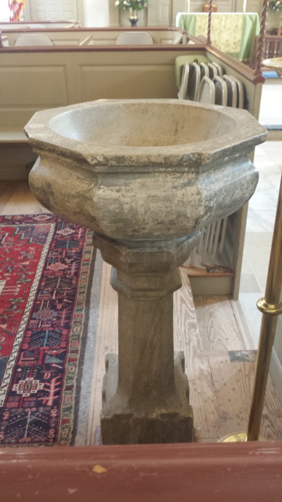 A receptacle for water, used for baptism. See also baptistery. (Medieval, 2022) Photo from Bruton Parish Episcopal Church, Williamsburg, Virginia, 2017.