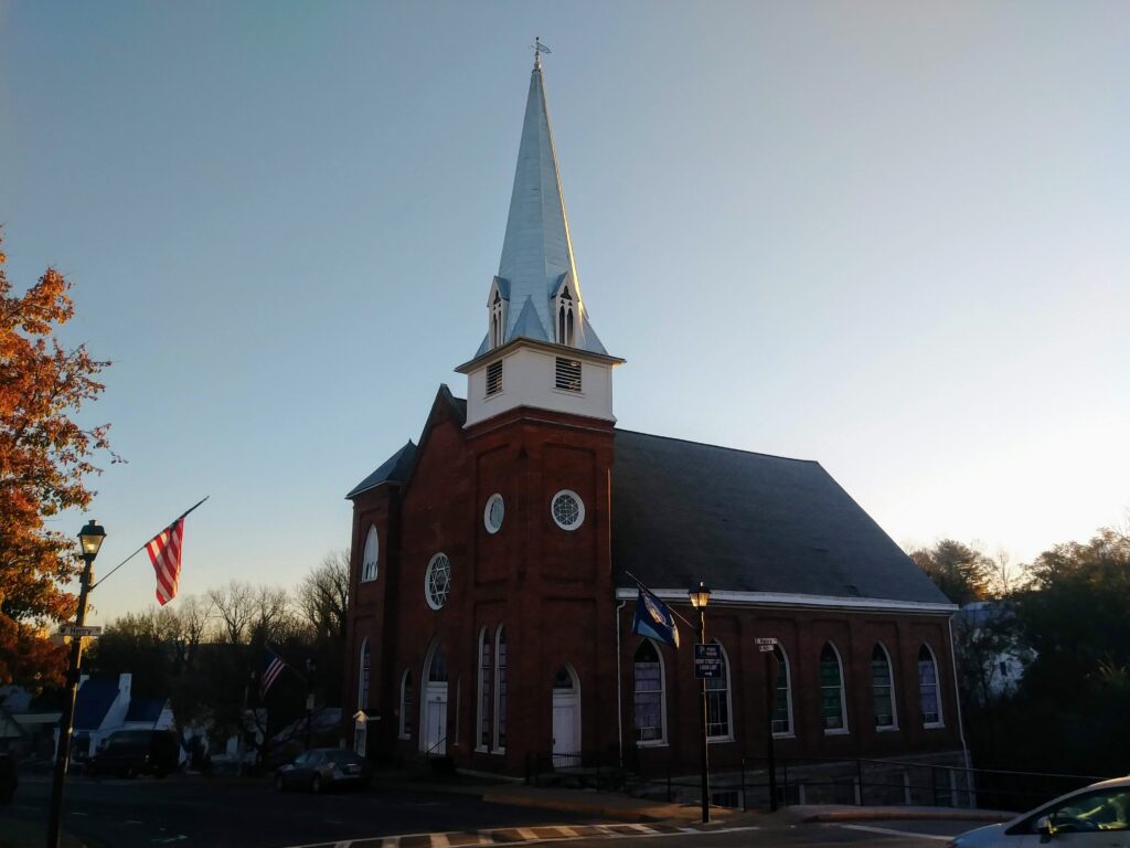 Octagonal spire rising from a square tower without a parapet, with pyramidal forms at the angles. Photo from Lexington, Virginia, 2018. (Axiom43)