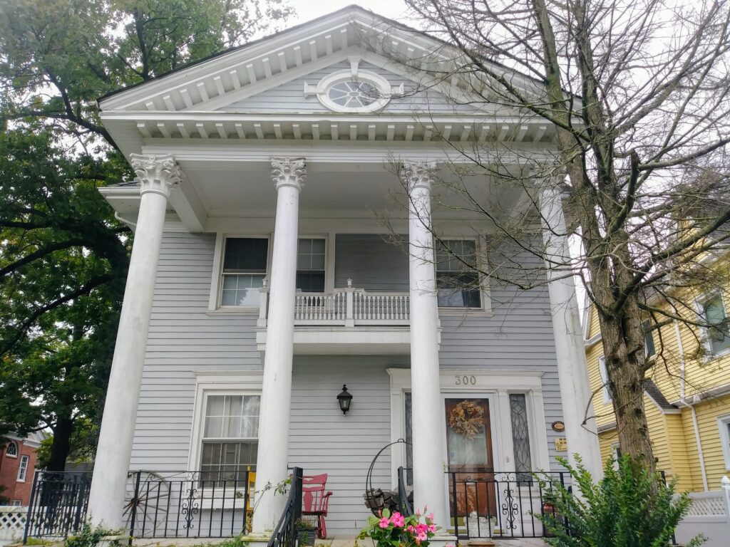 A portico that extends across two stories. Photo from Summit, New Jersey, 2018. (Kremer, 2017)
