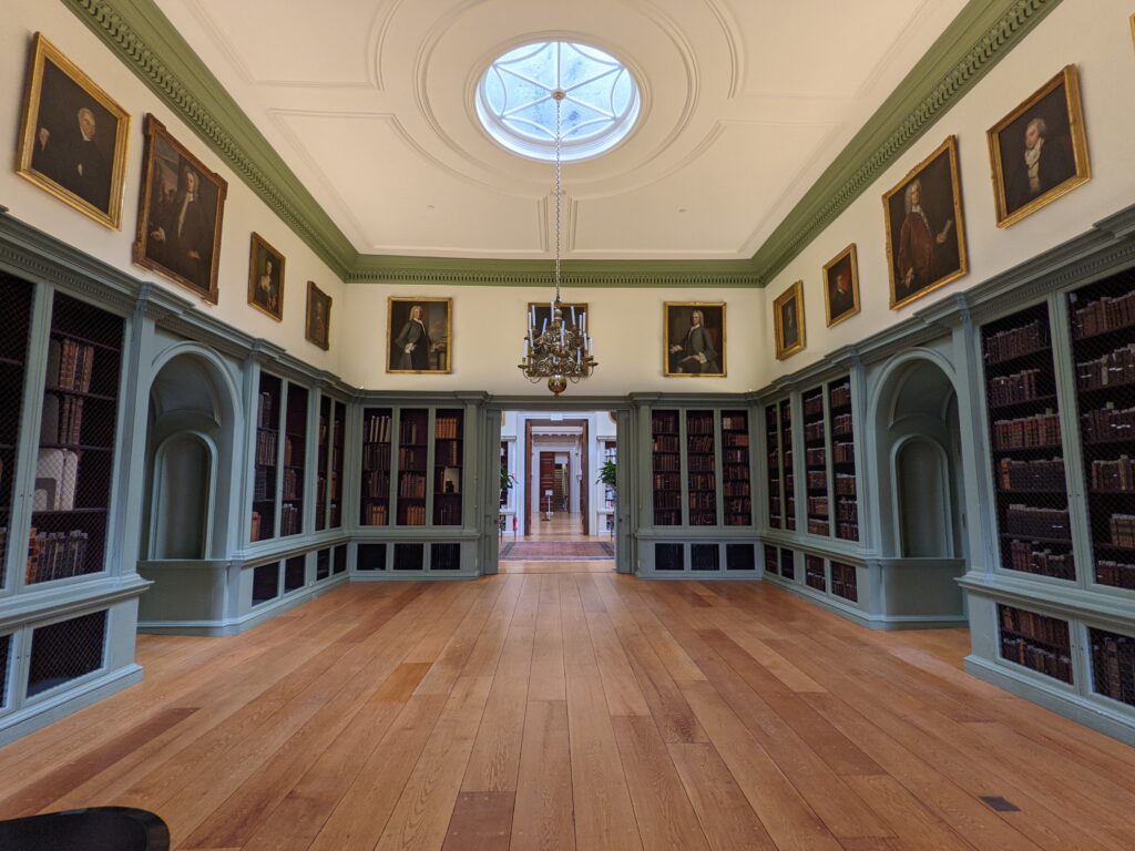 The alignment of a series of doors axially through a sequence of rooms. Photo of Redwood Library, Newport, Rhode Island, 2021. (Harris, 1977)