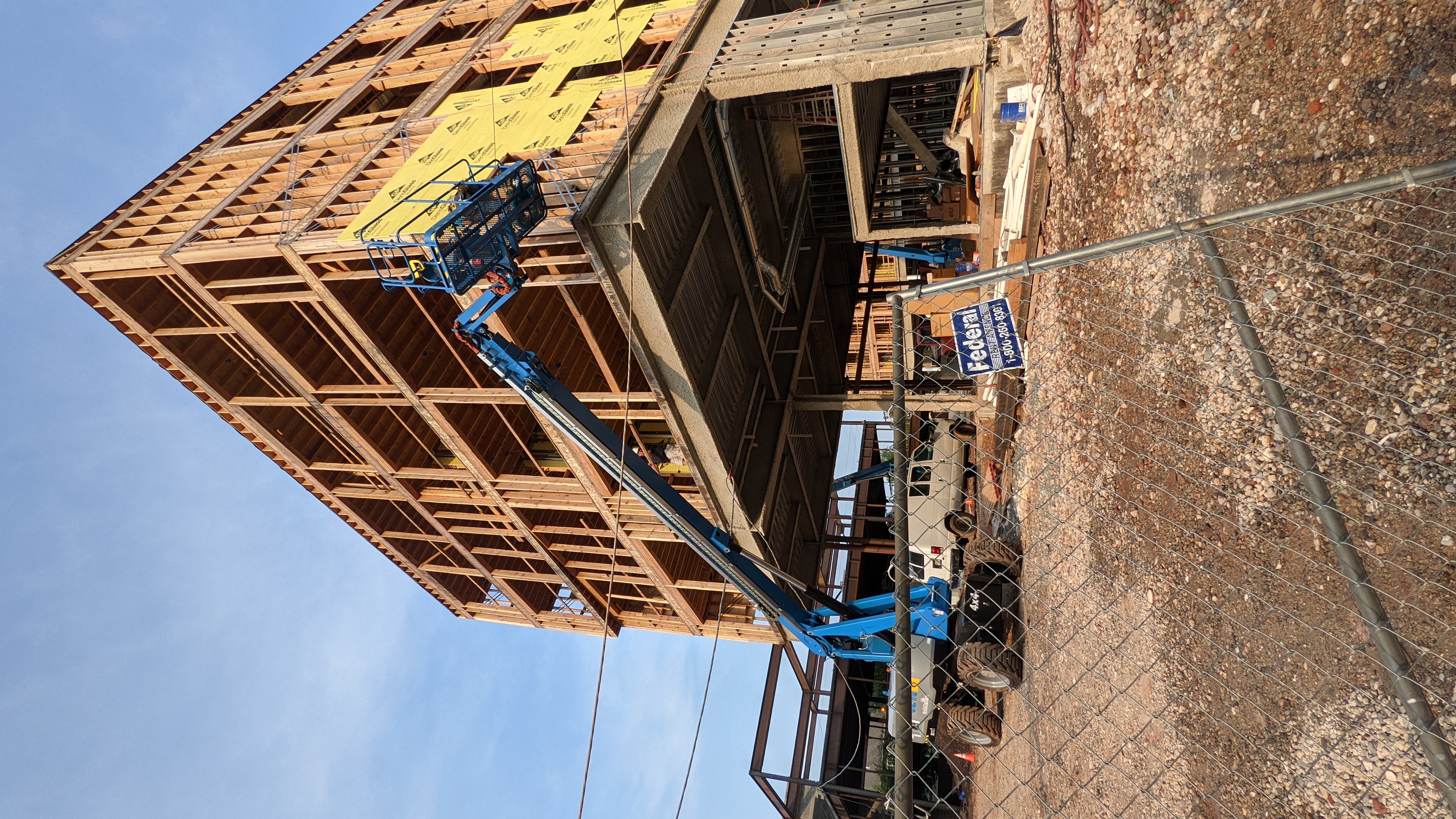 A building supported by a frame (timber, steel or reinforced concrete) rather than by load-bearing walls. (White & Robertson, 1991) Photo from Newark, New Jersey, 2021.
