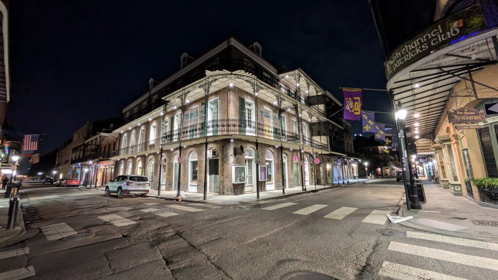 In French, a style of porch that often extended around at least three sides of the house and often was raised off the ground to the second-story level. It was supported by the house’s roof which extended beyond the house walls thus making the galerie intrinsic to the original house construction. (Kremer, 2023) Photo from New Orleans, Louisiana, 2024.