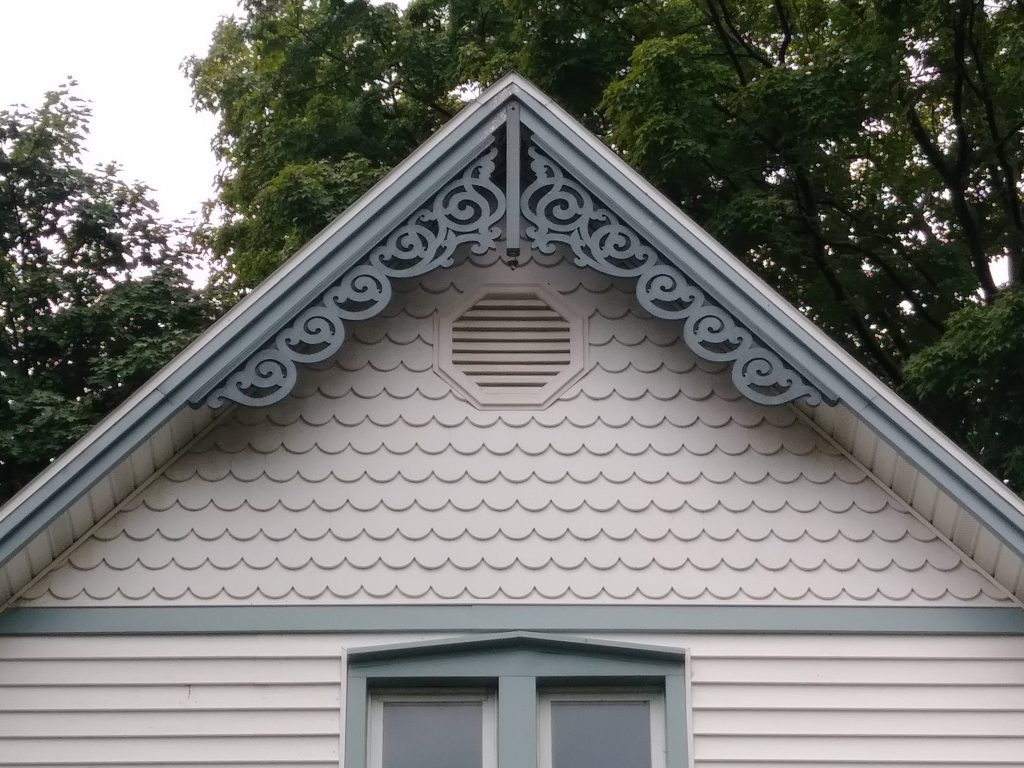 Pierced curvilinear ornament, executed with the jig saw or scroll saw, under the eaves of roofs. So called after the sugar frosting on German gingerbread houses. Photo from Traverse City, Michigan, 2018.(Whiffen, 1969)