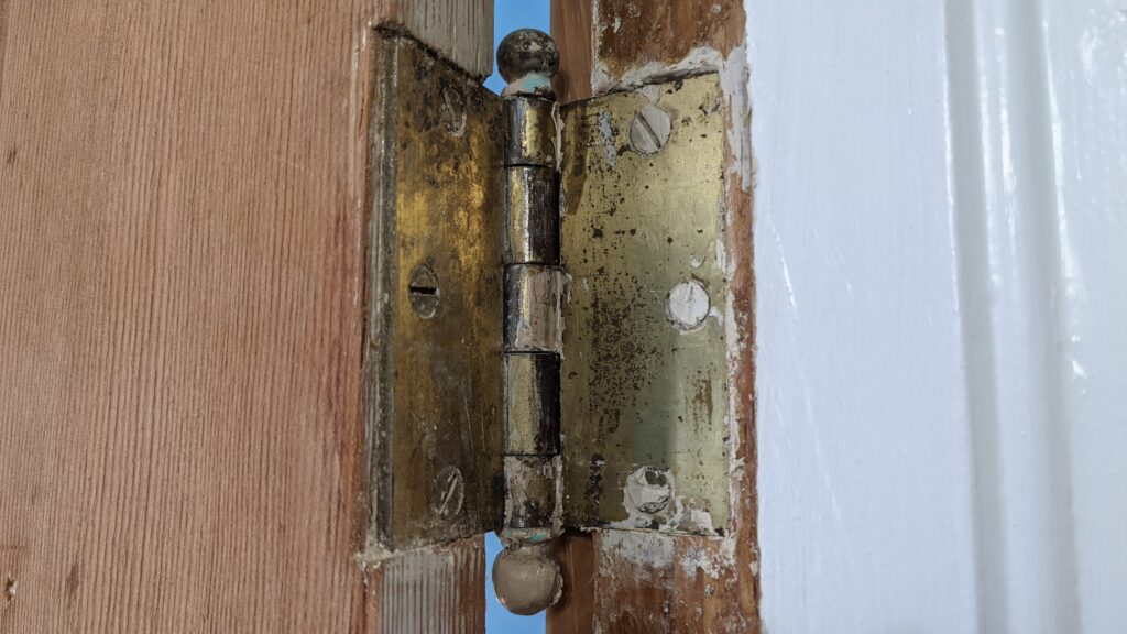 The stationary flat section (leaf) of a hinge. Photo from Metuchen, New Jersey, 2021. (Light, 1989)