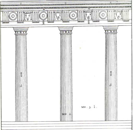The distance, measured in diameters, between twocolumns. The types named by Vitruvius, with the ratios later assigned to them, are as follows: Pycnostyle, 1 1/2 D; Systyle, 2 D; Eustyle, 2 1/4 D; Diastyle, , 3 D; Araeostyle, 4 D. Photo from Wikipedia. (Summerson, 1963)