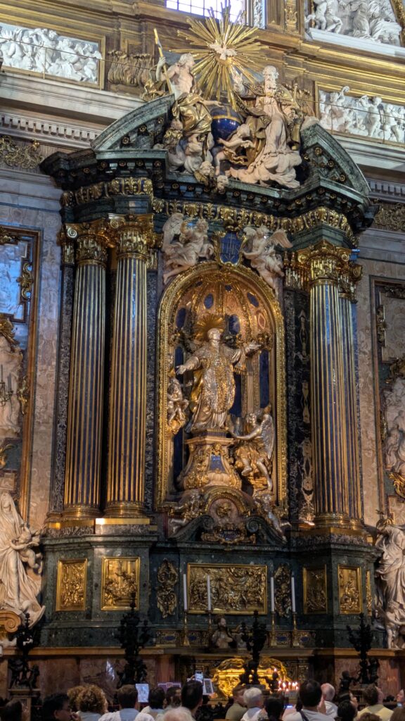 Photo of statue of St. Ignatius from transept chapel of Il Gesù in Rome, Italy, 2025.