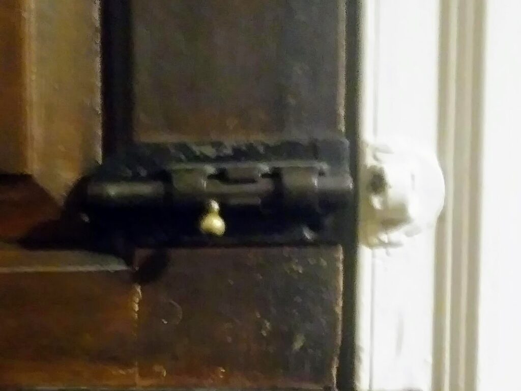 A catch for a door, usually a pivoted arm, the outer end of which engages a slot. Photo from Quincy, Massachusetts, 2019. (Saylor, 1952)