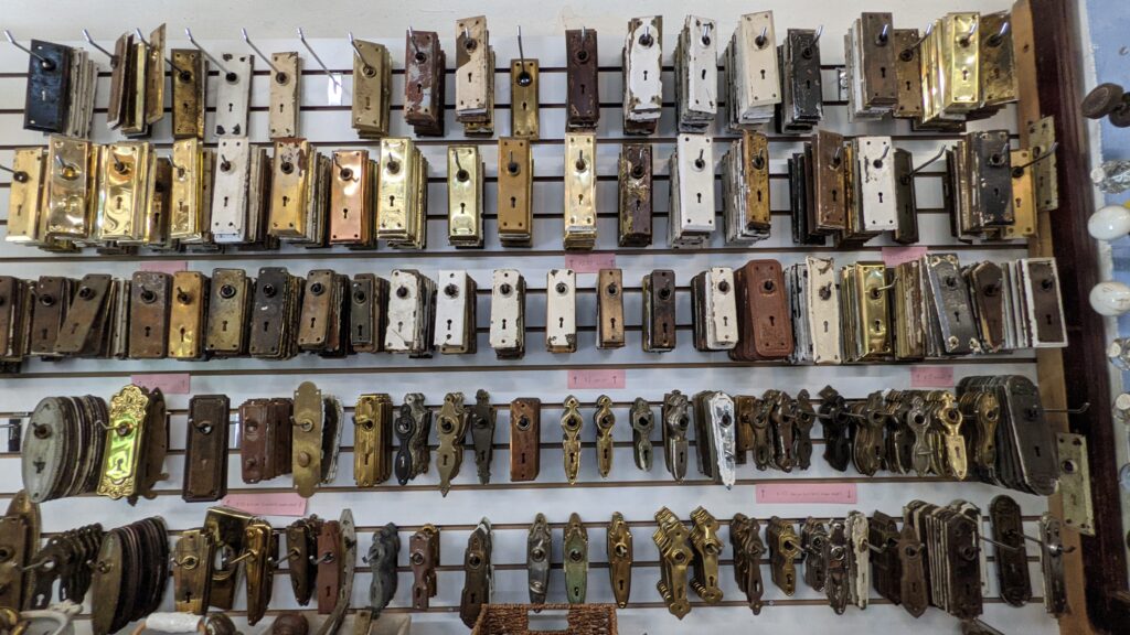 A plate to which a lock is affixed for closing a door shut and securing it by turning a lock by hand or with a key. (Kremer, 2017) Photo from Cheverly, Maryland, 2021.