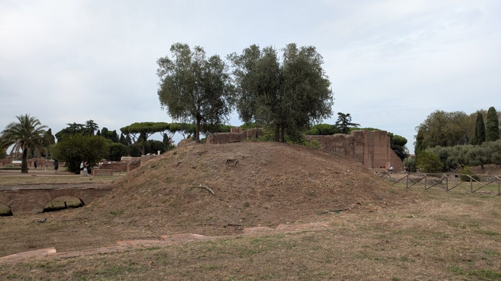 Classical sources consider the olive tree sacred to Minerva, as the goddess bestowed it upon humankind when she struck a rock with her spear and caused the first olive tree to spring from the ground. Olive oil became one of the Romans’ greatest treasures, used to light up the night, treat wounds and offer sustenance to the populace; olive branches honored illustrious citizens and victors. The olive trees present on the Domus Augustana, the great imperial palace built under Domitian on the Palatine Hill atop previous constructions, commemorate the emperor Domitian’s devotion to Minerva. Domitian dedicated numerous temples and homages to the goddess, as we can see by the great number of coins minted during his reign that bear her likeness. (Kremer, 2025)