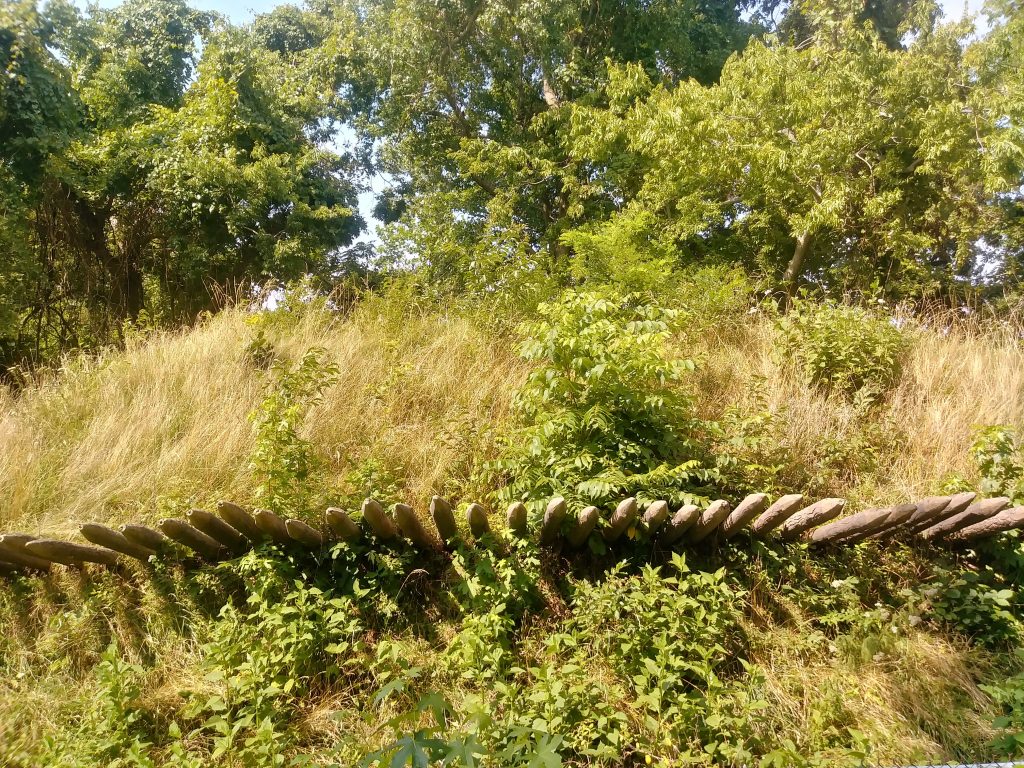 A stockade fence built by setting logs with pointed tops into the ground in long rows. Photo from Yorktown Battlefield, Yorktown, Virginia, 2019. (Foster, 2004)