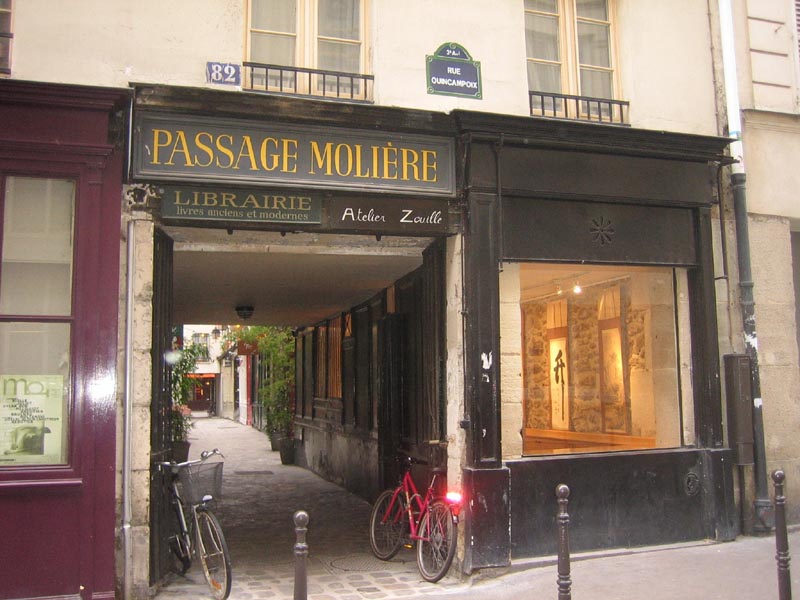 An interior corridor. In the center-passage house, a narrow space running from front to rear, the main entry at one end and a secondary entrance at the other. 2. An area, section, or detail of a work, especially with respect to its qualities of execution. Photo of Passage Moliere from Paris, France, 2007. (Foster, 2004)