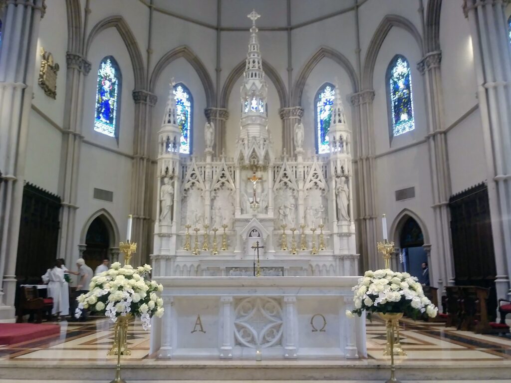 The narrow ledge on which an altarpiece rests on an altar. Photo from Pittsburgh, Pennsylvania, 2019. (Tudor History)
