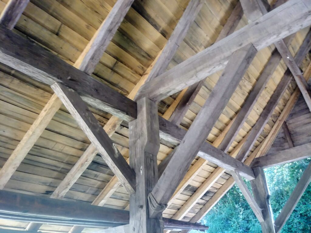 Part of a wooden roof frame, sloping down from the ridge to the eaves and establishes the pitch. Photo from Jamestown Settlement, Jamestown, Virginia, 2019. (Whiffen, 1969)