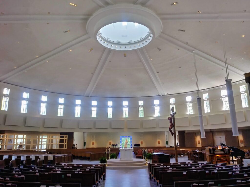 One whose plan is a circle; by extension, a church designed around a central vertical axis such as those of polygonal or Greek-cross form, though these are more accurately described as churches of the central type. Photo from Saint Bede Catholic Church, Williamsburg, Virginia, 2019. (Harris, 1977)