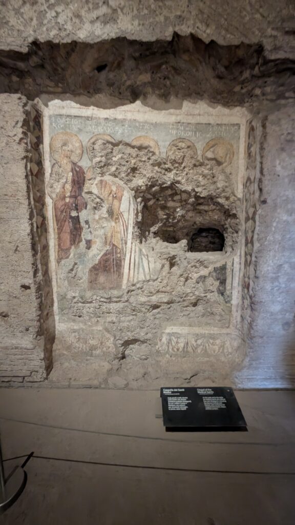 These saints were born brothers in Arabia, and studied in Syria. They were trained in medicine and served people for free. They were loved and respected by the people served for their charity and zeal for the Christian faith. During the persecution of Christians by Emperor Diocletian, they were apprehended by Lysias, the Governor of Cilicia, and after various torments were bound hand and foot and thrown into the sea. (Lives of the Saints). They are depicted in an eight century fresco from 705-707 in Chiesa di Santa Maria Antiqua in Rome. (Kremer, 2025) Photo from Rome, Italy, 2025.