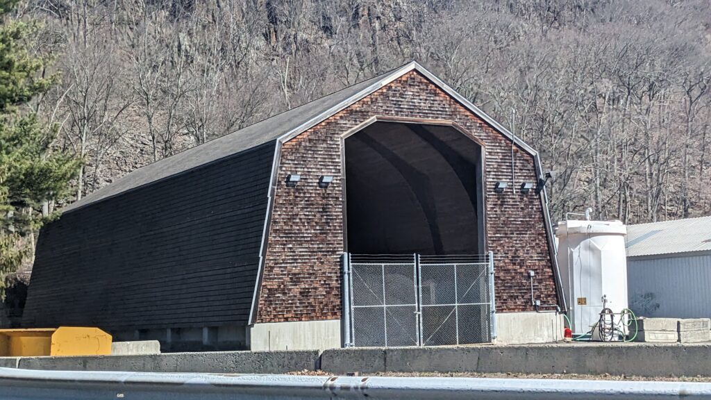 An open air structure for the storage of large piles of salt to use for deicing of roadways, common in the northeast and cold regions. (Kremer, 2024) Photo from Woodbridge, Connecticut, 2023.