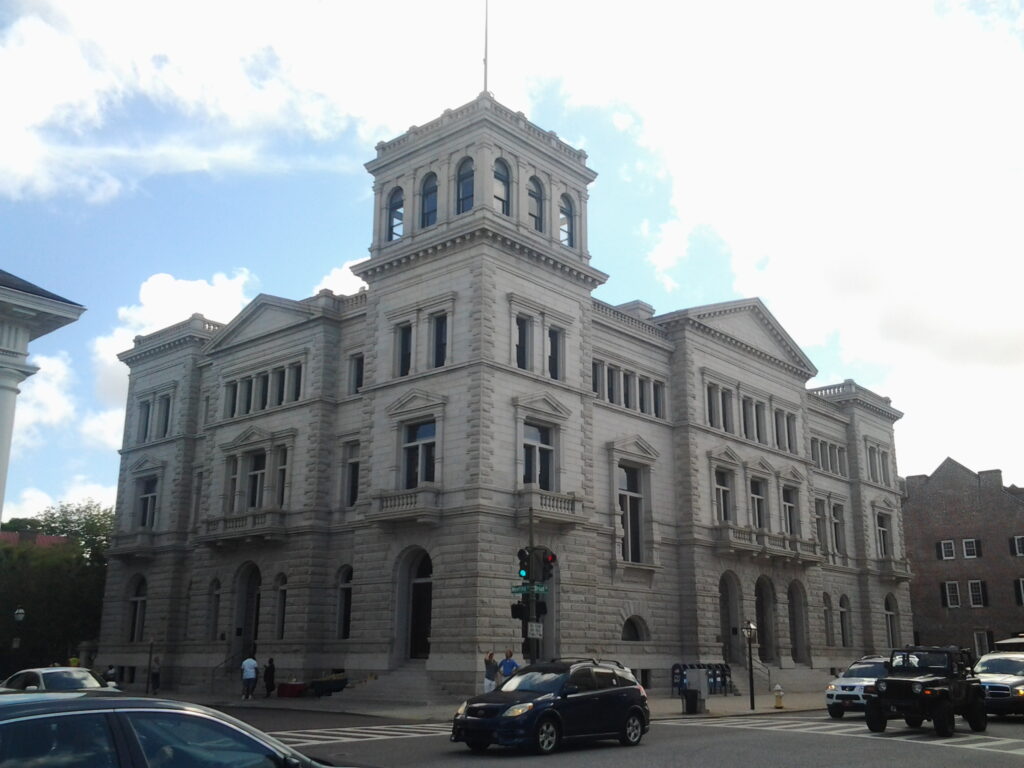 Buildings in the Renaissance Revival style show a definite studied formalism. The tightly contained cube is a symmetrical composition of early 16th century Italian elements. Characteristics include finely cut ashlar that may be accentuated with rusticated quoins, architrave framed windows, and doors supporting entablatures or pediments. Each sash may have several lights or just one. A belt or string course may divide the ground or first floor from the upper floors. Smaller square windows indicate the top or upper story. (Kremer, 2017) A leading example is the United States Post Office in Charleston, South Carolina. Photo from Charleston, South Carolina, 2013.