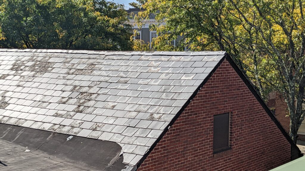 Flat roofing shingles made of slate. Although slate shingles were heavy and usually more expensive than most roof coverings, they were extensively used because of their fire resistant qualities. Slate roofing also lends itself well to a variety of decorative patterns. Photo from Princeton, New Jersey, 2022. (Phillips, 1994)