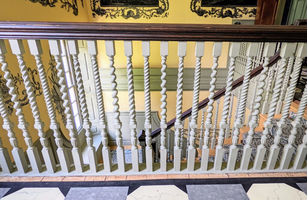 An upright, turned support for a stair rail. Photo from Schulyer House, Albany, New York, 2022. (Kremer, 2022)