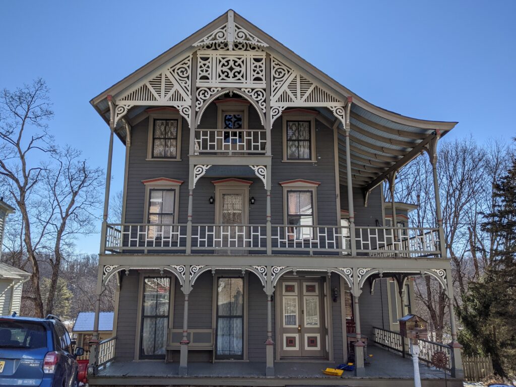 A wood house in the style of a Swiss mountain house. First promoted in the U.S. by A.J. Downing in 1850, and in several pattern books through the end of the 19th century. Typical elements include two stories, generally with a front-gable, low-pitched roof, front balcony or porch with scroll work railings and decoration, wide exposed beams and columns, wide eaves, and ornately carved and scrolled woodwork or board and batten siding. Photo from Blairstown, New Jersey, 2021. (Kremer, 2021)
